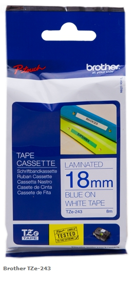 Brother Cinta mecanográfico azul sobre blanco TZe-243 TZ-243 18 mm x 8 m, laminado