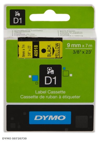 DYMO Cinta mecanográfico negro sobre amarillo S0720730 40918 9mm x 7m, Cinta-D1-estándard